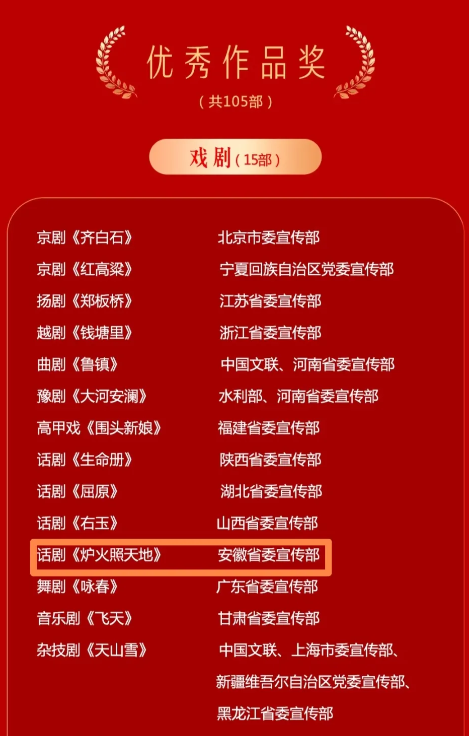 12月3日,中共中央宣傳部印發(fā)表彰決定,對第十七屆精神文明建設(shè)“五個一工程”組織工作先進單位和優(yōu)秀作品進行表彰。授予話劇《爐火照天地》等105部作品“優(yōu)秀作品獎”,授予安徽等15個省區(qū)市黨委宣傳部“組織工作獎”。